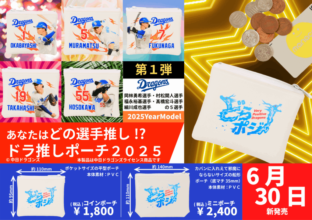 ドラ推しポーチ2025発売のお知らせ 2025年6月30日 最終更新日時 : 2025年10月23日 izuhiro 中日ドラゴンズ様ライセンスグッズ「ドラ推しポーチ2025」を2025年6月30日に発売しました。